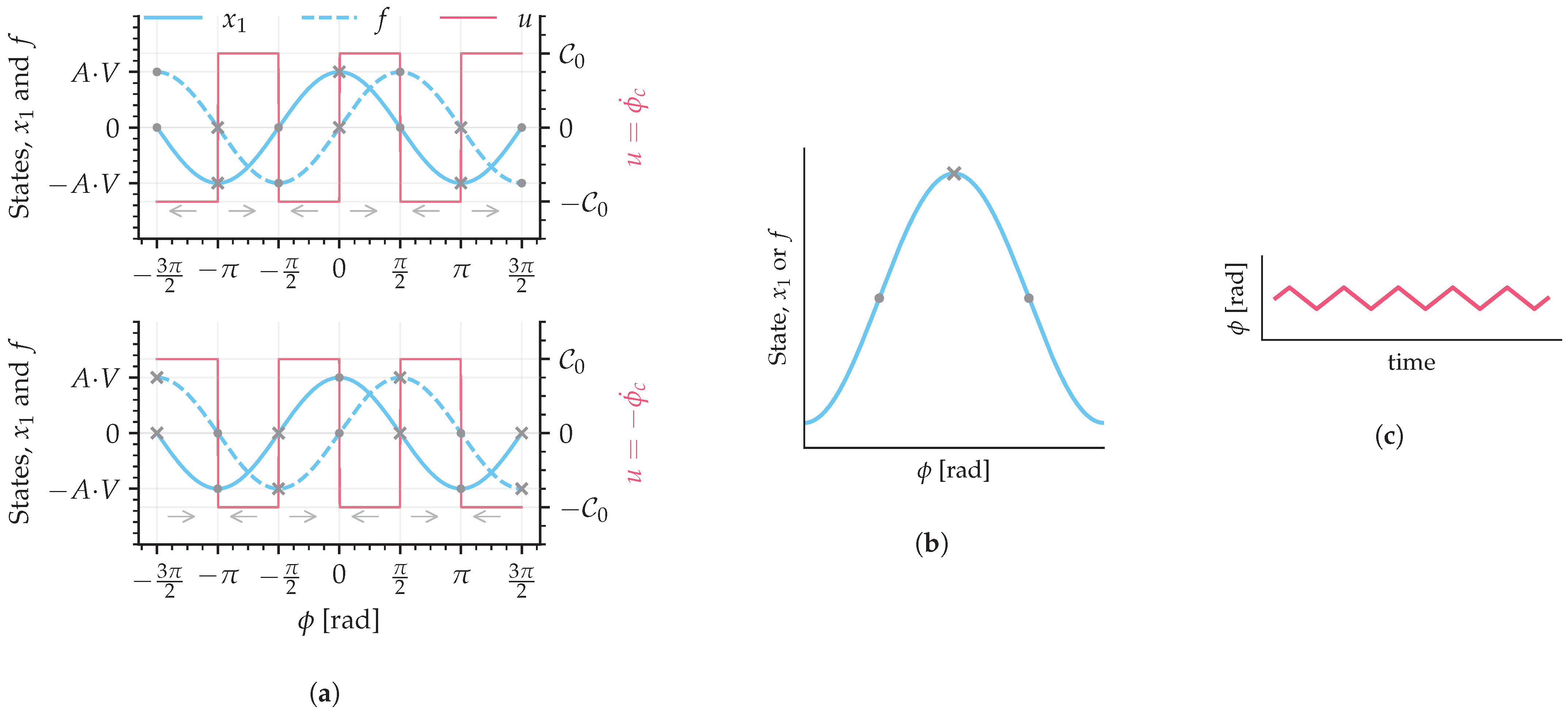 The control gain, , affects the velocity of the control phase shift. By inspecting one of the stable equilibrium points of a state variable (Figure 3b) and its resultant control phase shift (Figure 3c), the chattering phenomenon can be visualized. Since the frequency of the switching signal is finite, the resultant phase might overshoot the stable point, generating the chattering effect.