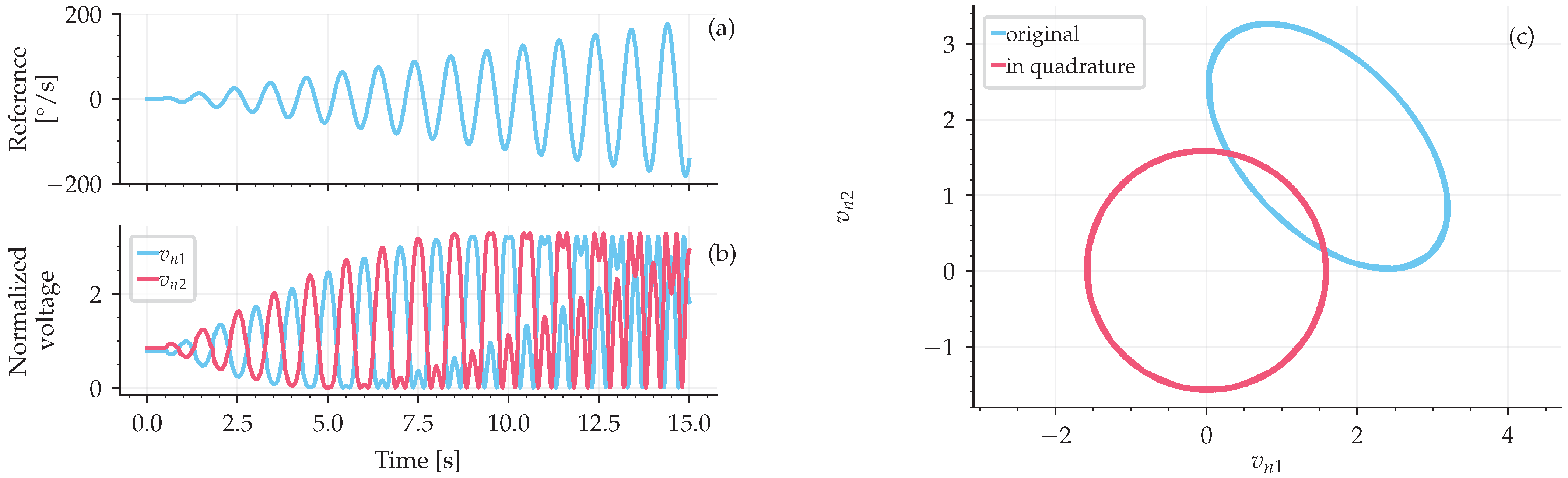 where . This quadrature correction must be calculated only once in order to calibrate the system. The quadrature signals and are inserted into the trigonometric calculation block of the closed-loop system, which provides the following state variables [9], as shown in Figure 2: