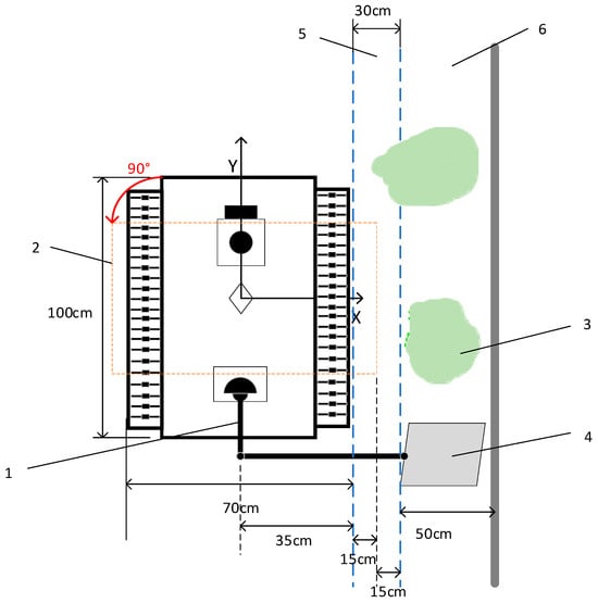 Figure 4 illustrates the operation area of the pushing robot: the robot arm consists of two parts, with each joint having 360° mobility, ensuring the execution of various pushing operations. The pushing plate can be stowed when not in use. The robot measures 100 cm in length and 70 cm in width. Based on practical considerations, the robot is designed to reach up to 30 cm into the trough to ensure that cows can access the furthest feed. When the robot moves in a straight line, the distance between the robot and the trough can be adjusted in the X-direction, with a maximum distance of 30 cm. During a 90° turn at the maximum distance of 30 cm from the trough, the robot’s body will extend 15 cm beyond the furthest line of the trough. To avoid contact with cows during turns, the robot’s turning error must not exceed 15 cm. Additionally, to accurately push feed to the target cows in front of the robot, the maximum error in the Y-direction should not exceed 20 cm, considering the actual intervals of the pasture fence.