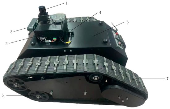 Based on the above analysis and related parameters, we acquired a tracked vehicle, as shown in Figure 5. The vehicle measures 100 cm in length, 70 cm in width, and 50 cm in height. It is equipped with a LiDAR, a ROS master controller, a depth camera, an IMU, a housing, and a tracked walking structure. The functions, including map building and navigation, are achieved by embedding the improved algorithmic model into this robot. The LiDAR generates a 2D map of the ranch environment. The Jetson Nano in the ROS master controller runs various neural networks that perform functions such as image recognition, target detection, and localization. The tracked differential PID drive module enables 360° steering in place. The mechanical drive structure is designed to be suitable for a wide range of terrains. The enclosure protects the internal components.