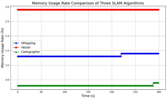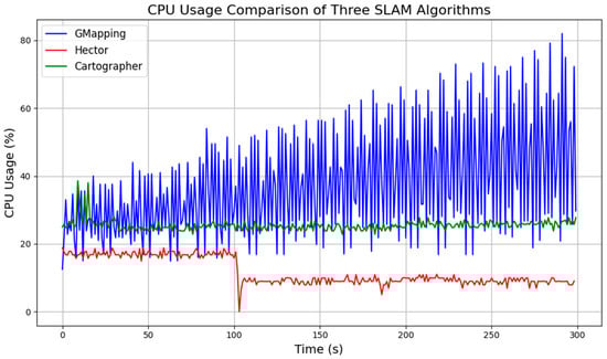 In addition, during the map-building process, there is a significant amount of data transfer between the robot’s master computer and the sensors. The algorithms place high demands on the computational power and memory of the computer. Therefore, it is necessary to test and compare the computational resource consumption of the algorithms. During the map-building process, the computer memory utilization and CPU occupancy were measured for each algorithm running separately. The results were plotted in the line graphs in Figure 10 and Figure 11.