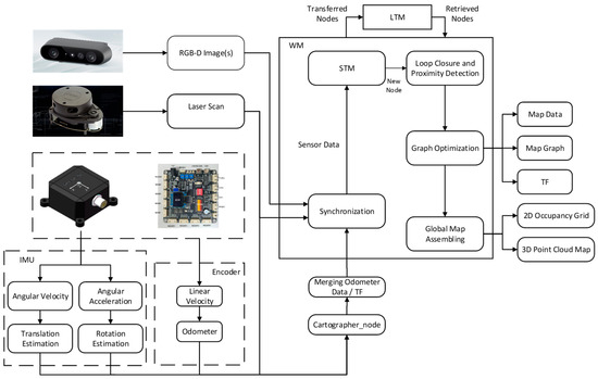 After completing synchronization, the sensor data are stored in the Short-Term Memory (STM) module, which creates corresponding map nodes for each frame of data and stores them. Simultaneously, all sensor data are transformed into the robot’s coordinate system using TF transformations based on LiDAR point cloud and depth camera data to generate localized 2D raster maps and 3D point cloud maps. Conversely, the odometer data provide position estimation information to ensure the accuracy of local map construction. Based on the odometer position information of each node, the system stitches the local maps together to form a global map. However, due to the cumulative error of the odometer, issues such as map drift or overlap may occur. Therefore, the accuracy of the odometer is crucial for the accuracy of the global map. The main improvement of this study is the highly robust fusion of LiDAR, odometer information, and IMU data using the Cartographer algorithm, which provides more accurate TF information to optimize the map-building process of RTAB-Map. Cartographer generates highly accurate robot position estimates from the optimized odometry and laser SLAM, and uses them as TF inputs to RTAB-Map. This enables RTAB-Map to build 3D point cloud maps based on more accurate position information, thereby reducing the impact of cumulative errors on map accuracy. Additionally, to further optimize the global map, closed-loop detection and global optimization are necessary. In the RTAB-Map algorithm, closed-loop detection is achieved using a visual bag-of-words model and a Bayesian filter. The visual bag-of-words model calculates the similarity between the current bit-pose node and the nodes in the working memory (WM), and updates the node’s weight based on this similarity to determine whether the node participates in closed-loop detection or is transferred to the Long-Term Memory (LTM) module.
