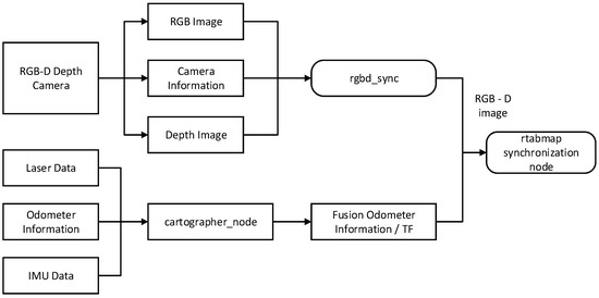 The input to the improved RTAB-Map algorithm comprises three main components: depth camera data, LiDAR data, and fused odometer data. The depth camera data are in RGB-D format, the LiDAR data are in Laserscan format, and the fused odometer data are fed into the system via a separate odometer node. The coordinates of the sensors and the robot’s chassis coordinates are input into the system through the Transform Frame (TF) software package (1.12.1). Since each type of data is input asynchronously through different topics, the synchronization module must first perform a timestamp alignment process. The data synchronization process is depicted in Figure 13. In this process, the rgbd_sync node accurately synchronizes the image and depth data from the RGB-D camera using the same timestamps. Subsequently, the system performs approximate synchronization with the LiDAR data and the fused odometer information to ensure the consistency of the multi-sensor data.