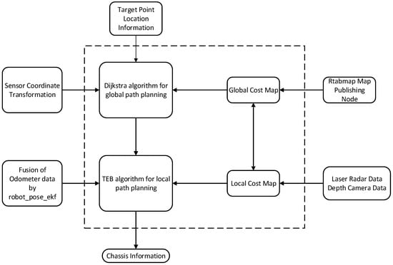 Path planning, robot localization, and autonomous obstacle avoidance are the three key components of autonomous robot navigation. In this study, efficient autonomous navigation of robots in complex environments is achieved by integrating multiple algorithms and techniques, with the algorithmic framework illustrated in Figure 14.