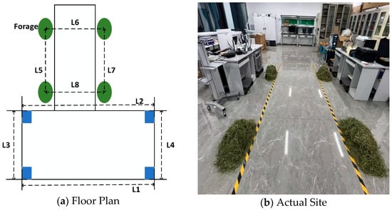 During the autonomous navigation process, most pasture-pushing robots typically follow a rectangular trajectory to traverse the entire pasture environment. Prior to conducting field tests in the pasture environment, the overall performance of the robot’s autonomous navigation was assessed in a relatively ideal environment through a simulated path navigation experiment conducted in the Key Laboratory of Intelligent Perception and System Engineering of the Inner Mongolia Autonomous Region. The floor plan and the actual site are illustrated in Figure 15.