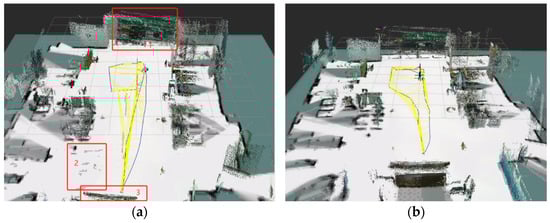To evaluate the impact of the improved RTAB-Map algorithm on the reconstruction of the 3D environment, the algorithm was tested both before and after the fusion of multi-source odometry data in the simulated ranch scenario. The results are presented in Figure 16.