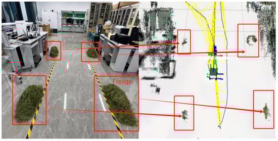 With the development of agricultural and animal husbandry informatization, both the deployment of intelligent IoT devices and the placement of robot platforms have laid the foundation for the popularization of agricultural and animal husbandry modernization and become a research hotspot in the digital and intelligent agricultural and animal husbandry fields [1,2,3,4]. In order to solve the problems of labor intensity, low time efficiency, and feed waste during manual feed pushing in the pasture, nowadays, many pastures have introduced intelligent pushing robots [5,6,7,8], and in order to achieve accurate pushing, map construction is the top priority, which is a prerequisite for a mobile robot to achieve autonomous navigation. The core technology of map construction is Simultaneous Localization and Mapping (SLAM). SLAM technology can be very effective in constructing a grid map of the agricultural and animal husbandry areas; as the basis of action of a functional robot, whether it is pushing materials, delivering materials, or carrying out other actions, an accurate map is a prerequisite. Autonomous navigation technology is at the core of pasture-pushing robots, and autonomous navigation technology is at the core of overgrowth robots. However, existing navigation systems such as guide rails, magnetic stripe guidance, or visual navigation methods are difficult to apply to the complex cattle field environment; therefore, further research is needed to develop a navigation system suitable for pasture-pushing robots.