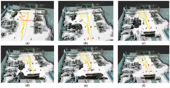 Figure 19a–f illustrate the sequential traversal process, with the robot returning to point 0 after visiting each point. During this process, the robot effectively plans its path and smoothly avoids obstacles to reach the set target points, as shown in Figure 20. Additionally, the robot completes path planning and initiates autonomous navigation with a delay of less than 2 s, meeting the low-latency requirement.