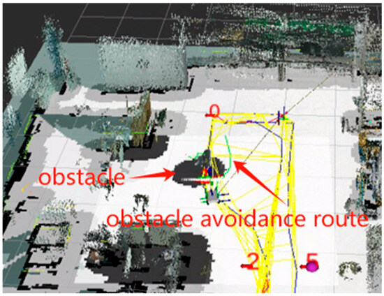 Obstacle avoidance experiment. Points 0, 1, 2, and 5 are four navigation target points predefined in Rviz.