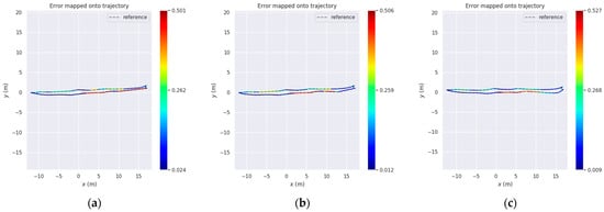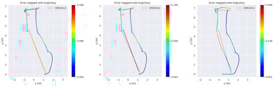 The absolute positional error plots for the three algorithms are shown in Figure 21a–c. As seen in Figure 21 and Figure 22, the improved RTAB-Map algorithm performs the best in terms of error control, with smaller errors and greater consistency with the reference trajectory. The original RTAB-Map algorithm is second, with slightly larger errors but still maintaining good consistency. The AMCL algorithm has the largest errors and the greatest deviation from the reference trajectory, indicating relatively poor performance. This is attributed to the rich visual information in the RTAB-Map algorithm, which provides detailed visual features such as edges, corner points, and textures, thereby enhancing localization accuracy and map detail.