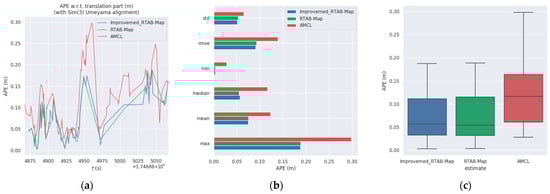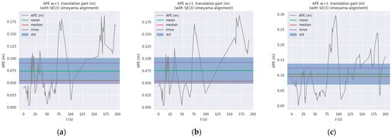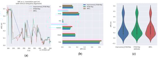 In addition, we used the EVO tool to compare our experimental results. EVO allows users to visualize, analyze, and evaluate SLAM algorithms and trajectory data. It helps to make the evaluation process more intuitive and informative. The evaluation metrics consider the absolute positional error (APE) values for both rotations and translations. APE is a metric used to assess the overall consistency of trajectories in SLAM.