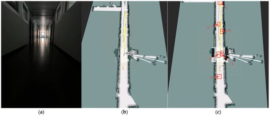 To validate the effectiveness of the improved algorithm under low-light conditions, a multi-point navigation experiment was conducted at six designated locations in Experimental Scenario 2. This scenario featured a narrow corridor measuring 25 m in length and 2.1 m in width, as illustrated in Figure 23. The experiments were performed under overcast weather conditions. Despite the dim lighting, the algorithm successfully generated high-quality 3D maps, as demonstrated in Figure 23b,c. Key metrics for Experiment 2 are summarized in Table 6.