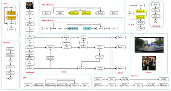 The YOLOv4 designed by Bochkovskiy et al. [] contains the following key improvements: (1) proposing the Cross-Stage Partial Connection (CSP) module, which optimizes the computational efficiency and accuracy; (2) using the Bag of Freebies and Bag of Specials methods to enhance the performance of target detection; and (3) introducing the Mish activation function and the optimized IoU loss function are introduced to particularly enhance the detection of small targets. An AP of 43.5% is achieved on the MS COCO dataset, which is especially good in real-time detection tasks. However, in complex traffic environments, occlusion and light variations still lead to the degradation of detection accuracy and problems of false and missed detections.