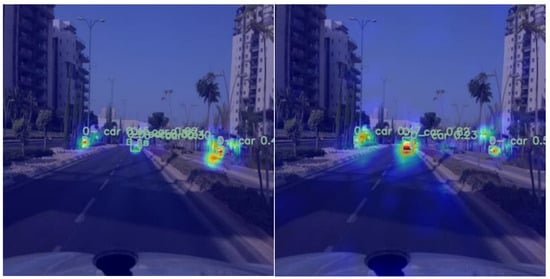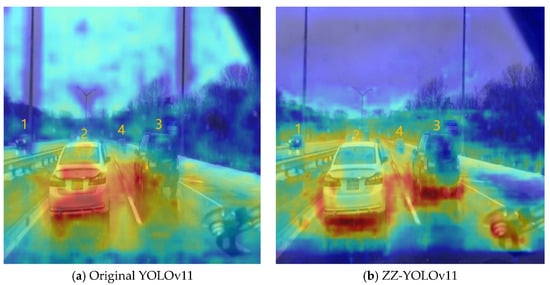 To further illustrate the performance of the improved model, the HiResCAM-heatmap [] was used, and the results are shown in Figure 9 below ZZ-YOLOv11, demonstrating a more focused and accurate heatmap distribution. The heat region in the right panel is more focused on the actual vehicle location, and the change in heat intensity is smoother and more natural, indicating that the algorithm is more deterministic about the target location. In contrast, YOLOv11 heat distribution is more dispersed, and the boundaries are unclear.