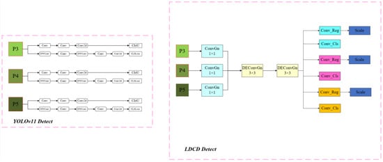 Although YOLOv11 incorporates the addition of two depth-separable convolutional layers (DWConv) in the detection head part, which dramatically reduces the number of parameters and computational overhead of the model while maintaining the performance, the number of parameters in its detection head is still at 30% of the network as a whole. In order to make the model lighter, the improvement of the detection head is indispensable; for this reason, the paper redesigned the head, and the new LDCD detection head structure is shown in Figure 4 below.