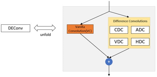 Detail-enhanced convolution (DEConv) [] is a special convolutional structure designed for enhanced detail perception, whose structure is shown in Figure 5 below. DEConv contains five convolutional layers (four difference convolution kernels and one normal convolution) that are deployed in parallel for feature extraction. Specifically, central difference convolution (CDC), angular difference convolution (ADC), horizontal difference convolution (HDC), and vertical difference convolution (VDC) are used to integrate traditional local descriptors into the convolutional layers, which allows for enhanced representation and generalization capabilities. Their main features are as follows: