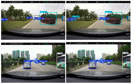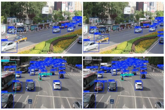 The UA-DETRAC-G2 public dataset was selected to verify the improved algorithm’s effectiveness and reasonableness on other public datasets. The results are shown in Figure 10 below. The left side shows the results detected by the original YOLOv11s algorithm, and the right side shows the results detected by the improved ZZ-YOLOv11 algorithm.