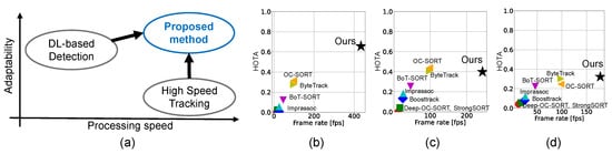We give comprehensive reviews about tracking methods of template image-based, motion-based, deep learning and hybrid methods. For template image-based tracking, template matching [18], calculating the similarity between a pre-defined template image and the current frame, is widely used, but it is not adapted to rotational and scale changes. Additionally, correlation filter-based methods are known for their balancing robustness to scale and rotational changes and processing speed [19,20,21,22,23,24,25]. They employ the fast Fourier transform (FFT) to reduce the computational load required to create and update template images. In particular, the Minimum Output Sum of Squared Error (MOSSE) tracker utilizes raw images to calculate correlation filters, achieving high-speed processing rates of over 500 fps [20]. However, this method is sensitive to changes in appearance, making it less suitable for long-term tracking. While other derivative methods offer higher accuracy, they often sacrifice processing speed. For motion-based tracking, calculating optical flow, which represents the distribution of apparent velocity, is widely used. There are two main methods: feature-based sparse optical flow and pixel-wise dense optical flow [26,27,28]. In sparse optical flow, only selected features are tracked, allowing for high-speed processing. However, finding appropriate and robust features can be challenging. In contrast, some dense optical flow methods, which analyze every pixel, have achieved high-speed processing rates of over 300 fps [27,28]. While it is useful to extract motion of targets with vague boundaries like a human’s joint, it is usually sensitive to background noise. Deep learning-based methods are also employed for versatile tracking applications. For instance, Generic Object Tracking Using Regression Networks (GOTURN), which relies on offline training, achieved tracking of unknown objects at 100 fps [29]. However, GOTURN is sensitive to changes in appearance. Siamese Network-based tracking methods have been widely developed, offering promising results [30,31,32,33,34]. For accurate tracking, the Multi-Domain Convolutional Neural Network (MDNet) combines both offline and online training, but its high computational requirements result in slow processing speed [35]. To achieve a high-speed and robust tracking system, hybrid tracking methods has been tackled. Nishimura et al. [36] achieved robust tracking by integrating several correlation filter-based methods. In [37,38,39,40], a tracking method has been developed that combines deep learning-based detection with template-based tracking, incorporating a retracking mechanism in case the tracking score is low. The work by Matsuo et al. [41] succeeded in tracking a transparent object with low latency (618 fps) combining deep learning-based detection [42], motion detection, and correlation filter-based tracking [20]. Our proposed method was inspired by this research. However, these methods typically focus on a single target, so consistent, efficient management of asynchronous information is required for more complex scenarios such as MOT.