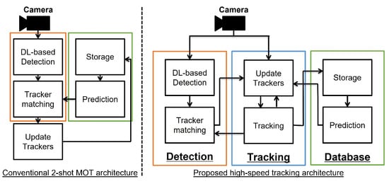 Tracking architecture of the conventional two-shot multiple object tracking and the proposed high-speed tracking systems. The orange box represents the detection module, the blue box denotes the tracking module, and the green box illustrates the database module.