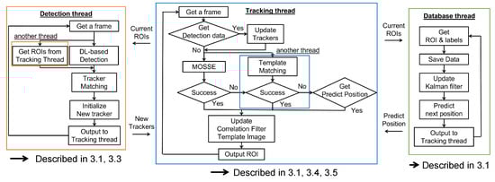 The tracker’s template image in the tracking thread is updated using results from both the detection thread and the previous step of the tracking thread. For the tracker’s position, we use either the tracking thread or the database thread—based on Kalman Filter prediction, which offers faster updates than deep learning-based detection. In the database thread, Kalman Filter models with constant velocity assumptions are updated using results from the tracking thread. Further details on data exchange and tracker management are provided in Section 3.2.