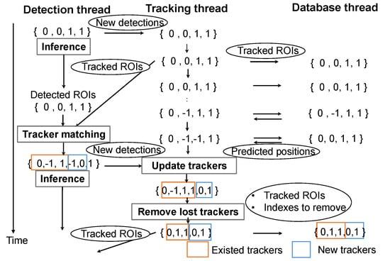 Tracker removal is handled carefully to maintain consistency across threads. If a tracker has not been updated for several frames (i.e., exceeds ), it is marked for removal. Since the number of trackers should only change when new deep learning-based detection results are available, removal occurs only when the tracking thread receives new tracker data from the detection thread. Trackers marked for deletion are removed when the tracking thread sends the latest tracker list to the detection and database threads, as illustrated in the “Remove lost trackers” part of Figure 4. Trackers with label ‘−’ in the orange box are removed from both the tracking and detection threads in this example. As mentioned above, to keep the database thread synchronized, the tracking thread sends not only the updated ROI information but also the indices of the removed trackers.