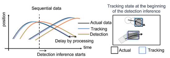 The matching process between trackers in the detection and tracking threads is illustrated in Figure 5, which shows sequential data and the tracking state at the beginning of deep learning-based detection inference. As depicted, the tracking thread operates with low latency, resulting in minimal deviation between the actual and tracked positions. Therefore, by using the most recent tracked ROIs available in the tracking thread, the proposed system can accurately associate trackers between the detection and tracking threads.