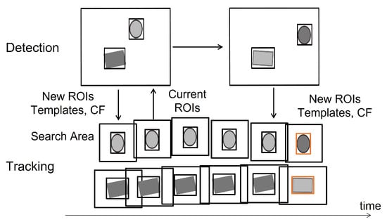 Overview of the hybrid tracking system combining deep learning-based low-frequency detection with classical high-frequency tracking methods. In the detection row, the large black box represents the entire image, while the smaller boxes around the objects indicate their ROIs. In the tracking row, the larger black boxes denote the search areas, and the smaller boxes represent the ROIs of the tracked objects. The horizontal axis indicates the time sequence. Orange boxes highlight the moments when the templates and correlation filters in the tracking thread are updated based on detection results.