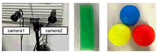 Experiment settings. (left) illustrates the cameras used to capture videos. (right) illustrates objects, plastic case and balls.