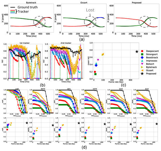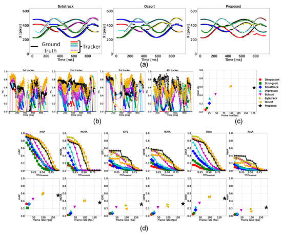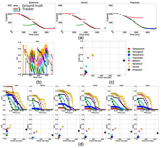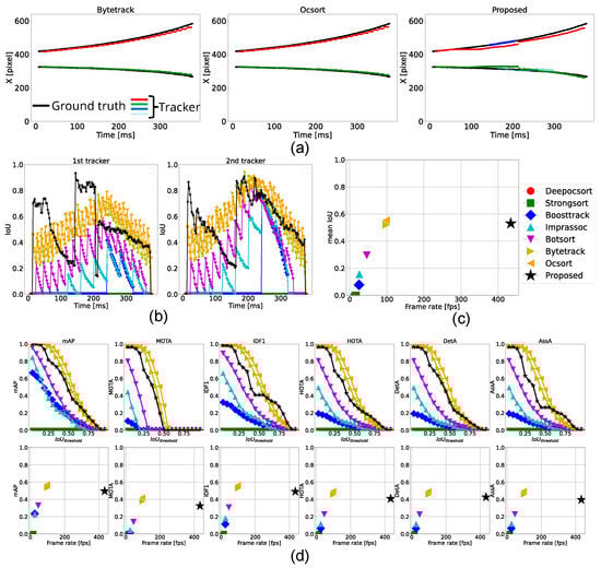 On the other hand, in the metric transitions shown in Figure 8d, the proposed method exhibited slightly lower scores than ByteTrack and OC-SORT at higher IoU thresholds. This drop was primarily due to false detections from the classical detector, which was observed in the first tracker from around t = 100∼300 ms in Figure 8, which deviated from the ground truth. This implied that the proposed method requires frequent updates by deep learning-based detections due to its limited robustness in long-term tracking.