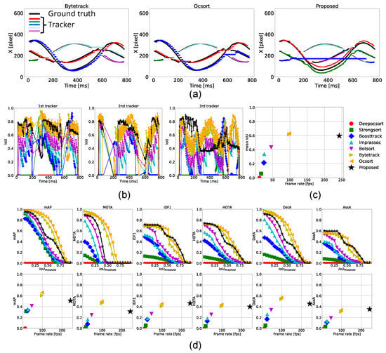 According to Table 11, the proposed method operated faster than existing methods, and outperformed all conventional approaches across all metrics for both detection and association accuracy. As shown in the estimated center positions in Figure 14a, ByteTrack and OC-SORT suffered from tracker ID switching around ms and ms, while the proposed method overcame this. As shown in IoU and metric transitions in Figure 14b–d, the proposed method kept tracking with higher IoU, resulting in higher metrics over all . These results demonstrate that the proposed method is effective in handling partial occlusions and long-term fast object tracking. As in other scenarios, the bottom panels of Figure 14c,d show that processing speed has greater influence than deep learning-based appearance features on both detection and association performance.