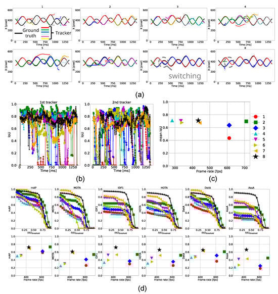 In the eighth row of Figure 13a, the introduction of update skipping successfully prevented a tracker ID switch around ms, an issue unresolved in Method 7. Furthermore, consistent color plots in Figure 13a, stable IoU values exceeding 0.6 in Figure 13b, and the highest scores in each metric by shown in Figure 13b indicate that both balls were reliably tracked in terms of detection and association. Although the tracker occasionally deviated from the ground truth around t = 900 ms, as shown in Figure 13a, due to update skipping, it successfully recovered to the correct position through deep learning-based updates. As shown in Table 9, Method 8 (our proposed method) achieved the best overall performance, with a MOTA of 0.611, IDF1 of 0.719, and HOTA of 0.656.