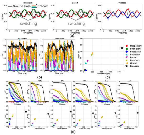 Tracking results for two accelerated balls. (a) Trajectories of the horizontal position (x-coordinate) of the ball centers tracked by ByteTrack, OC-SORT, and the proposed method. Plots with colors, but black represents each estimated trackers. (b) Temporal transition of IoU for each ground-truth tracker. (c) Comparison of each method in terms of frame rate and mean IoU. (d) Top row: Relationship between IoU threshold and performance metrics including mAP, MOTA, IDF1, HOTA, DetA, and AssA. Bottom row: Relationship between frame rate and each performance metric.