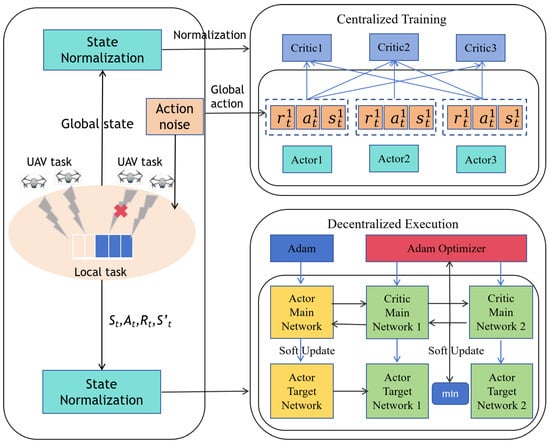 After modeling the optimization problem as a Markov Decision Process (MDP), we integrate the MATD3 algorithm with the multi-UAV MEC system to propose the MATD3-TORA (Multi-Agent Twin Delayed Deep Deterministic Policy Gradient for Task Offloading and Resource Allocation) algorithm framework, as illustrated in Figure 1. Each agent is equipped with an independent actor network and dual-critic networks—consistent with the core design of the TD3 algorithm. The actor network generates actions based on the current state, while the dual-critic networks evaluate the expected returns of actions to guide the actor network’s updates.