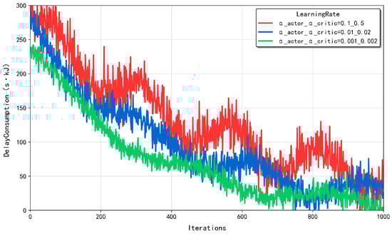 Figure 2 illustrates the convergence performance of the MATD3-TORA algorithm in a multi-agent environment under varying learning rate configurations. In actor–critic algorithms, the learning rates of the policy network (actor) and the value network (critic), denoted as and , play a pivotal role in ensuring stability and convergence. Typically, these learning rates require meticulous tuning to adapt to diverse learning environments and tasks. For instance, and can be set to 0.1 and 0.5, smaller values such as 0.01 and 0.02, or even 0.001 and 0.002. As depicted in the figure, all three learning rate combinations achieved convergence. However, when and were set to 0.1 and 0.5 or 0.01 and 0.02, the algorithm converged to suboptimal solutions. This is primarily attributed to excessively high learning rates, which result in large update steps during iterations, causing the algorithm to overshoot the optimal solution. In contrast, when and were set to 0.001 and 0.002, the algorithm converged to superior results. This is because a moderate learning rate allows the algorithm to explore the solution space more thoroughly, enabling the discovery of better strategies. This analysis underscores the importance of carefully selecting learning rates to balance exploration and exploitation, thereby enhancing the algorithm’s ability to identify optimal policies in complex multi-agent environments.