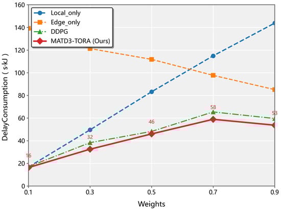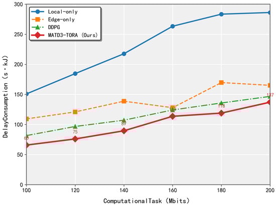 As illustrated in Figure 5, the performance of the MATD3-TORA and MADDPG algorithms was evaluated as the task volume increased from 100 Mbits to 200 Mbits, with measurements taken at 20 Mbit intervals. The results demonstrate that both MATD3-TORA and MADDPG significantly outperformed the Local-Only and Edge-Only strategies in terms of weighted delay and energy consumption. Notably, the rate of increase in weighted delay and energy consumption for MATD3-TORA was lower than that of Local-Only and Edge-Only algorithms. This advantage stems from MATD3-TORA’s ability to determine optimal offloading ratios, thereby validating its effectiveness in task allocation. Although the convergence results of MADDPG and MATD3-TORA show minimal numerical differences, this is expected, since MATD3-TORA is an enhanced version of MADDPG, which is primarily designed to improve learning efficiency and stability rather than significantly altering the final outcomes. This analysis underscores the superior performance of MATD3-TORA in handling varying task volumes, highlighting its capability to achieve efficient and stable task offloading in dynamic environments.