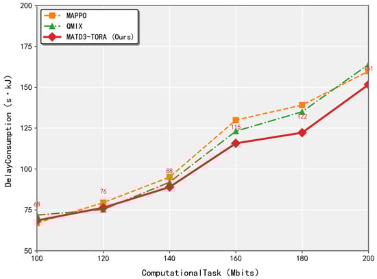 As seen in Figure 6, the proposed MATD3-TORA algorithm demonstrated superior adaptability and efficiency compared to MAPPO and QMIX when handling diverse task volumes. While existing methods struggle to maintain optimal offloading decisions under increasing computational loads, MATD3-TORA dynamically adjusts its resource allocation strategy through its hybrid decentralized–centralized architecture. This enables more effective balancing of latency and energy consumption across the UAV network. In contrast, MAPPO exhibits policy divergence under heavy task loads due to its unconstrained policy updates, while QMIX suffers from rigid value decomposition that fails to adapt to varying computation requirements. MATD3-TORA’s twin-delayed learning mechanism and task-aware optimization allow it to maintain stable performance across different workload intensities, whereas competing methods show significant degradation as task volumes scale.