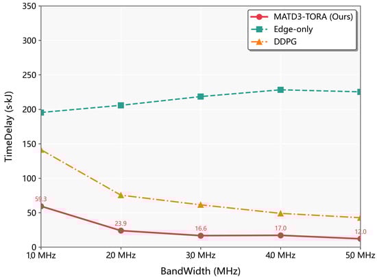 The performance variation of algorithms (MATD3-TORA, Edge-only, and MADDPG) under varying transmission bandwidths.