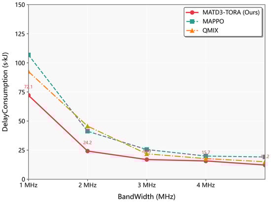 The performance variation of algorithms (MATD3-TORA, MAPPO, and QMIX) under varying transmission bandwidths.