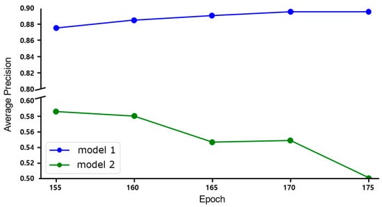 A graph illustrating the contrasting self-training results based on the base model. Although the same data and parameters were applied, the self-training outcomes differed due to the base model’s accuracy variation. The blue-colored Model 1 shows a performance improvement as the training progressed, whereas the green-colored Model 2 exhibits performance degradation.