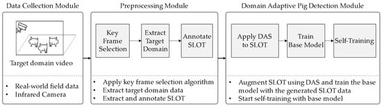 The proposed system consists of the following three modules: data collection, preprocessing, and domain-adaptive pig detection. Figure 2 shows the overall proposed system architecture.