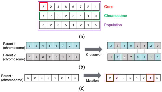 The GA’s components and operations: (a) visually shows the components of the GA, including the gene, chromosome, and population; (b) visually illustrates the crossover operation, one of the processes in the GA; (c) visually illustrates the mutation operation, another process in the GA.