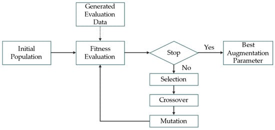 Once the search space is defined, it is necessary to determine which search algorithm will be used for exploration. Various search algorithms exist, but this study employs a GA, which can provide multiple reasonable solutions rather than a single solution for discontinuous data. This is particularly important in our setting, where the augmentation policy consists of multiple discrete and interdependent parameters (e.g., zoom type, transformation flag, and magnitude). Compared to brute-force strategies, the GA is known to be more effective in exploring high-dimensional combinatorial spaces due to its population-based and stochastic search mechanisms []. The GA consists of genes, chromosomes, and a population. A gene represents each parameter to be applied, while a chromosome represents a set of parameters. These chromosomes collectively form a population. The core procedure of the GA is as follows: (1) Randomly initialize the initial population; (2) evaluate the fitness of the parent chromosomes; (3) select only the chromosomes with high fitness to serve as parents for the next generation; and (4) generate new offspring chromosomes through crossover and mutation operations based on the selected parent chromosomes. Here, crossover refers to an operation that exchanges portions of genes between two parent chromosomes to create a new offspring chromosome. At the same time, mutation is an operation that randomly modifies a chromosome’s genes, typically with a low probability. Repeat steps 2–4 to explore the optimal augmentation parameters. Figure 4 visually illustrates the GA’s key components and operational processes. Algorithm 1 shows the pseudo-code of the GA.