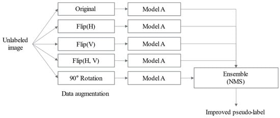 In this study, self-training is performed using the previously trained base model as the initial model, ensuring that the model learns the features of the target data. The key aspect of self-training is increasing the diversity and reliability of pseudo-labels. The proposed system applies data distillation (DD) [], which enhances diversity through scaling and horizontal flipping. Vertical flipping and 90-degree rotation transformations are incorporated into the self-training process. Figure 6 illustrates the DD method applied in the proposed system.