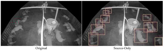 Domain shift [,] is a significant cause of model performance degradation, arising from distribution differences between source and target data. Deep learning models operate based on pre-trained datasets, but discrepancies may exist between training data (source) and monitoring data (target) in real farm environments. Differences between the data collection environment and the new environment can lead to model performance deterioration. For example, variations in lighting conditions, camera angles, pigsty structures, pig growth stages (size changes), breed differences, and other environmental factors can create different data distributions from the environment in which the model was initially trained. The greater the disparity between the source and target data, the more significant the drop in model accuracy [].