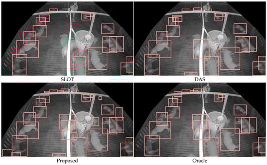 The SLOT data refer to data that have been manually annotated, specifically containing ground truth labels for pig objects in images collected from the target-domain pigsty. Utilizing SLOT data provides the following advantages: (1) Since it includes high-quality annotations for the target domain, it allows for the application of intensive and diverse augmentations. (2) It enables accurate learning of the target domain’s features, including background and structures. Learning is particularly effective in monitoring systems where background and structures remain unchanged once installed. If the target domain has unique structures or patterns, SLOT provides an opportunity to learn these characteristics. (3) As the base model for self-training learns the target domain’s features, pseudo-labels’ reliability improves, minimizing the risk of accuracy degradation in subsequent training stages. As a result, SLOT serves as an efficient approach that maximizes benefits while requiring minimal human labor.