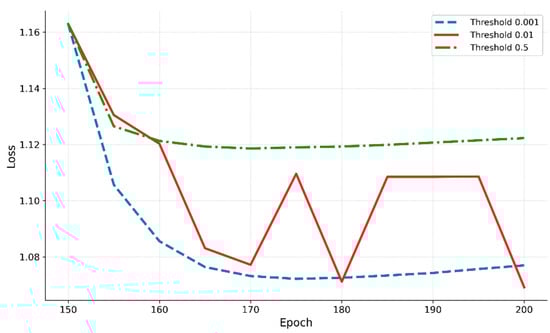 Most conventional self-training approaches select pseudo-labels based on high confidence thresholds to minimize label noise [,,,,]. In contrast, this study adopts a super-low-threshold strategy. This choice is grounded in the hypothesis that, following the DAS phase, the performance of the initial base model is sufficiently improved, making even low-confidence predictions potentially beneficial for learning.