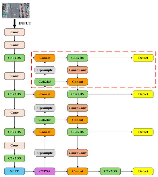 To address the difficulty of small object detection in UAV-acquired images, a collaborative optimization strategy is introduced. This strategy integrates an improved C3K2 module and substitutes the Focaler-WIoU loss for the conventional CIoU loss, aiming to enhance the model’s precision in identifying small-scale vehicle targets. Furthermore, coordinate convolution (CoordConv) is incorporated into the Neck component of the architecture to strengthen the network’s spatial representation capabilities. In addition, a supplementary detection head is added specifically for small object recognition, further reinforcing the model’s multi-scale detection capacity. Collectively, these architectural modifications contribute to a reduction in both false positives and missed detections while simultaneously boosting overall detection performance. Figure 1 depicts the structural layout of the enhanced YOLOv11s model, in which the area enclosed by the red rectangle corresponds to the supplementary detection head.