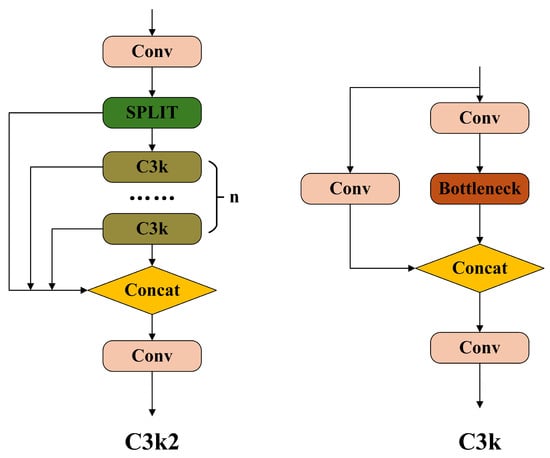 In the YOLOv11 architecture, the C3K2 module includes a configurable C3K parameter that determines whether to activate the module. When disabled, the Bottleneck module is used in its place. The C3K module supports adjustment of convolutional kernel sizes to enhance the capture of features at various scales. Its architectural details are visualized in Figure 2. Importantly, increasing the kernel size of the C3K module introduces a large number of parameters, which may cause deep features to lose critical details from shallower levels. On the other hand, using a smaller 1 × 1 convolutional kernel fails to expand the receptive field, making it more difficult to capture spatially adjacent features.