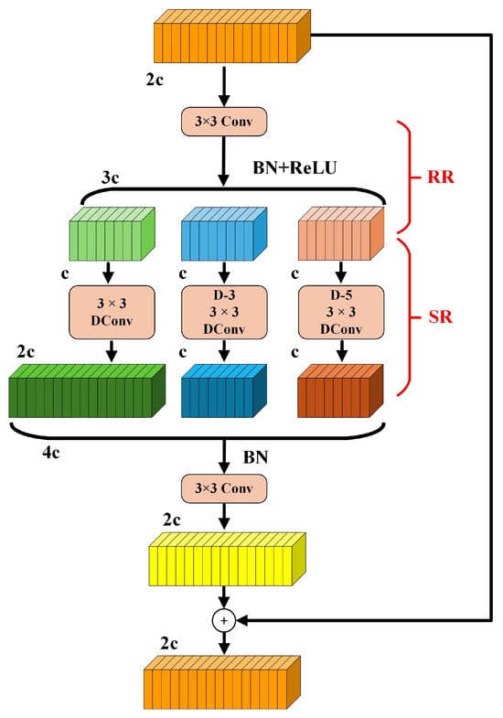 The DWR module is designed with a two-stage architecture that integrates both regional and semantic residual enhancements. Initially, the input feature map undergoes a 3 × 3 convolution operation coupled with a nonlinear activation function, which serves to reduce feature complexity while maintaining essential spatial structure. Subsequently, multiple parallel dilated convolution layers with dilation rates set to d = 1, 3, and 5 are applied to perform morphological filtering across regions of different sizes. This allows the network to capture contextual information from both local and mid-range receptive fields, thereby improving its responsiveness to objects across a variety of scales. To further support stable gradient flow and ensure effective end-to-end learning, residual pathways are incorporated in order to mitigate issues such as gradient vanishing in deeper network layers.