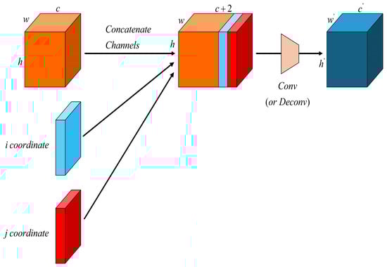 In contrast to standard convolution, Coordinate Convolution (CoordConv) [26] introduce additional x-coordinate and y-coordinate channels appended to the input feature map. The structure of the CoordConv operation is illustrated in Figure 7. As shown in the figure, during the forward pass, the input feature map is augmented with coordinate values i and j, which are stacked alongside the original feature map and then processed by convolutional filters. This explicit injection of positional information enables the model to better capture spatial relationships, improving localization precision, especially for small and irregularly distributed vehicle targets in UAV scenes.